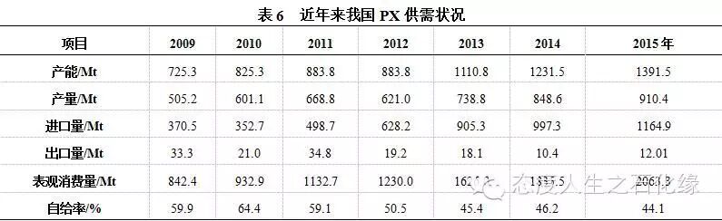 芳烃为大宗基础有机化工原料,*重要的是苯、甲苯和二甲苯,主要用于合成树脂、合成橡胶、合成纤维等产品。由于聚酯工业发展迅速,对芳烃产品尤其是对二甲苯(PX)的需求急剧增加。2015年我国PX对外依存度增长至55.9%,并呈现进一步扩大的态势。近年来我国PX供需状况见表6。